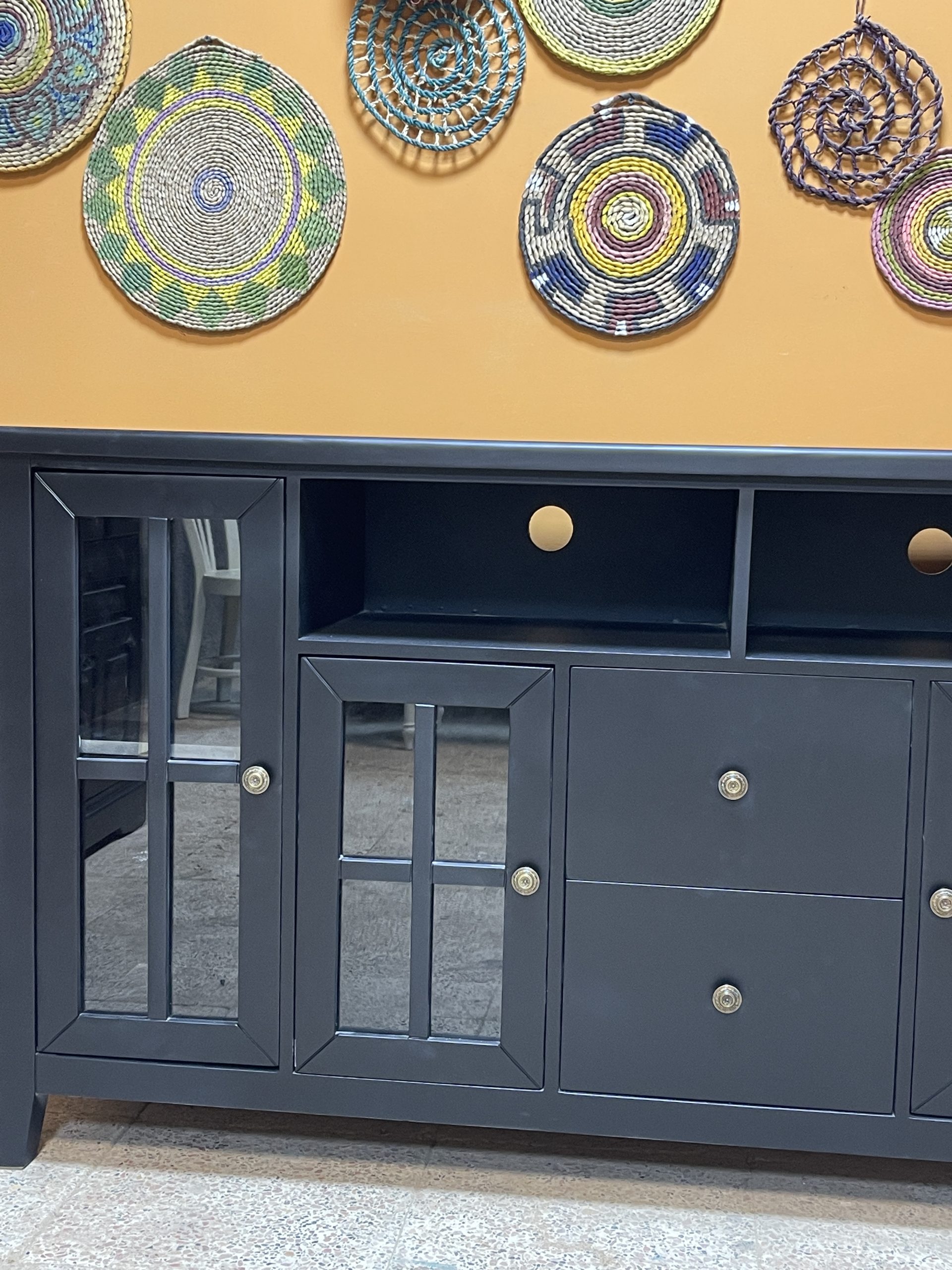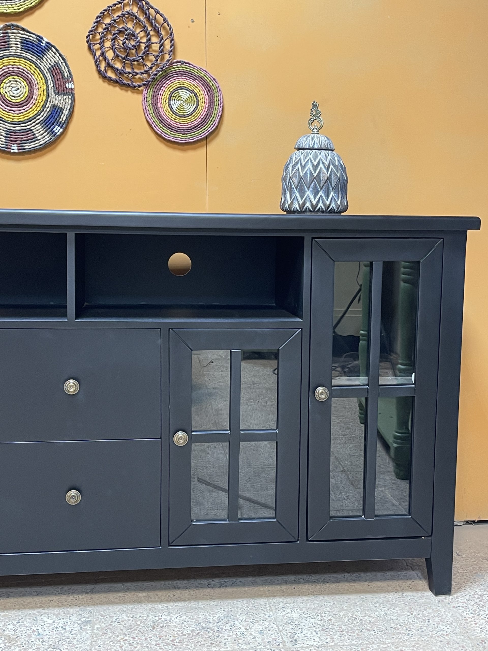 کنسول نور مشکی دارای درب کمدی هست که فضاهای تفکیک شده از یکدیگر دارند، همچنین این درب ها دارای طبقاتی هستند که فضای بیشتر به شما ارائه می دهد. اما به قسمت وسطی این کنسول که برسیم دو کشو و دو باکس می بینیم که دو باکس بالا برای گذاشت دستگاه های مربوط به تلویزیون است. اما اگر شما می خواهید مانند کنسول از این محصول استفاده کنید این قسمت را میتوانید با دکوری های بسیار شیک پر کنید.