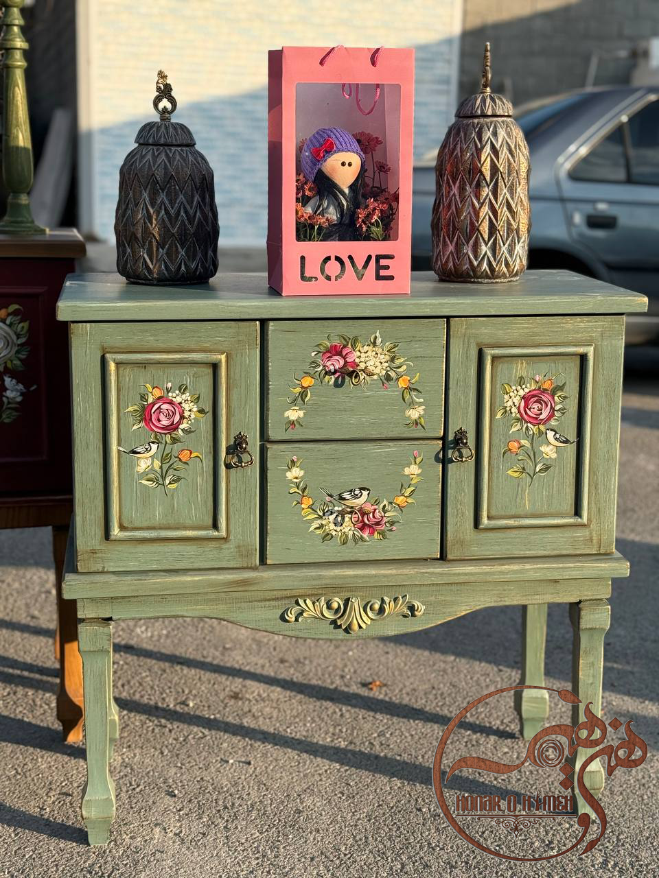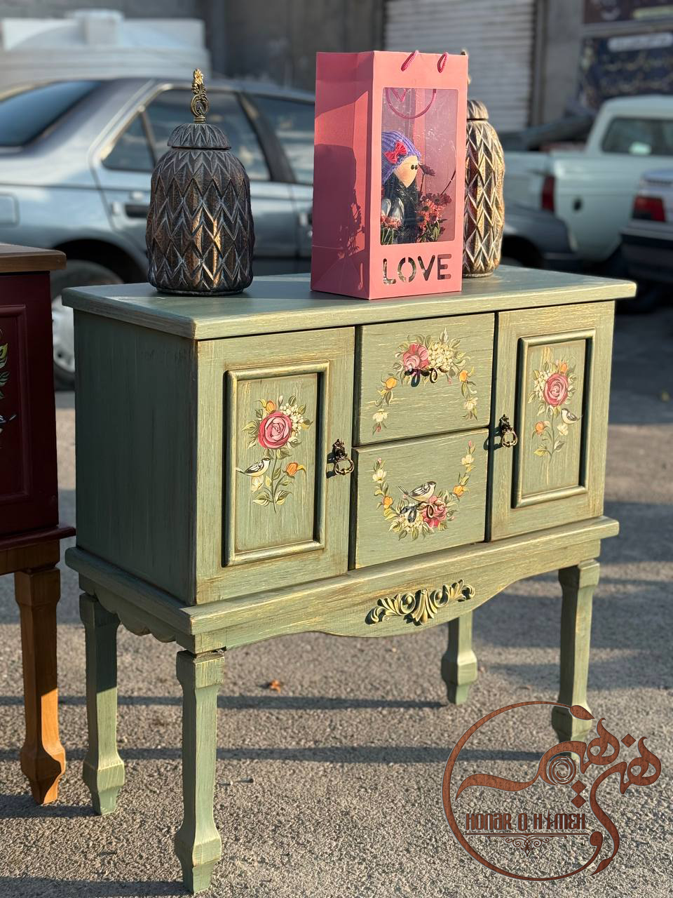 روی درب های این کنسول زیبا قنچه های قرمز با ترکیب رنگی زیبا کار شده که بسیار زیبایی این کار را هزاران برابر کرده است. علاوه بر این نقاشی حلقه ای که روی کشو ها کشیده شده است طوری است که اگر کشو ها بسته باشند مانند یک حلقه ی گل می ماند.
