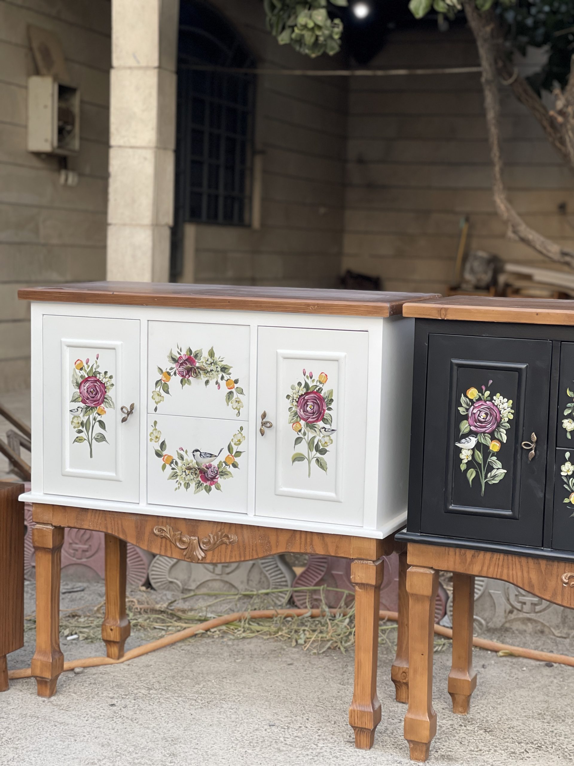 روی درب های این کنسول زیبا قنچه های قرمز با ترکیب رنگی زیبا کار شده که بسیار زیبایی این کار را هزاران برابر کرده است. علاوه بر این نقاشی حلقه ای که روی کشو ها کشیده شده است طوری است که اگر کشو ها بسته باشند مانند یک حلقه ی گل می ماند.