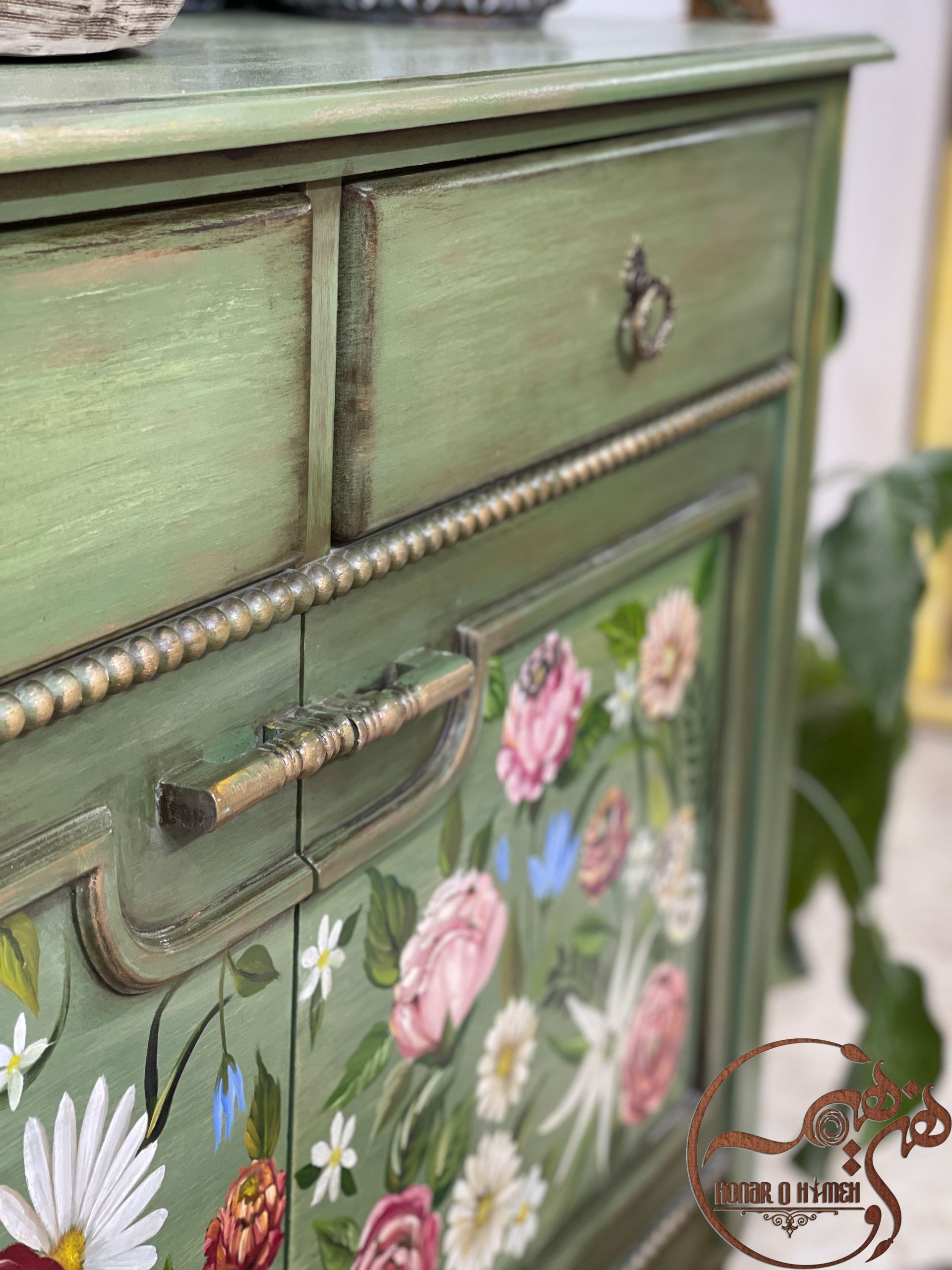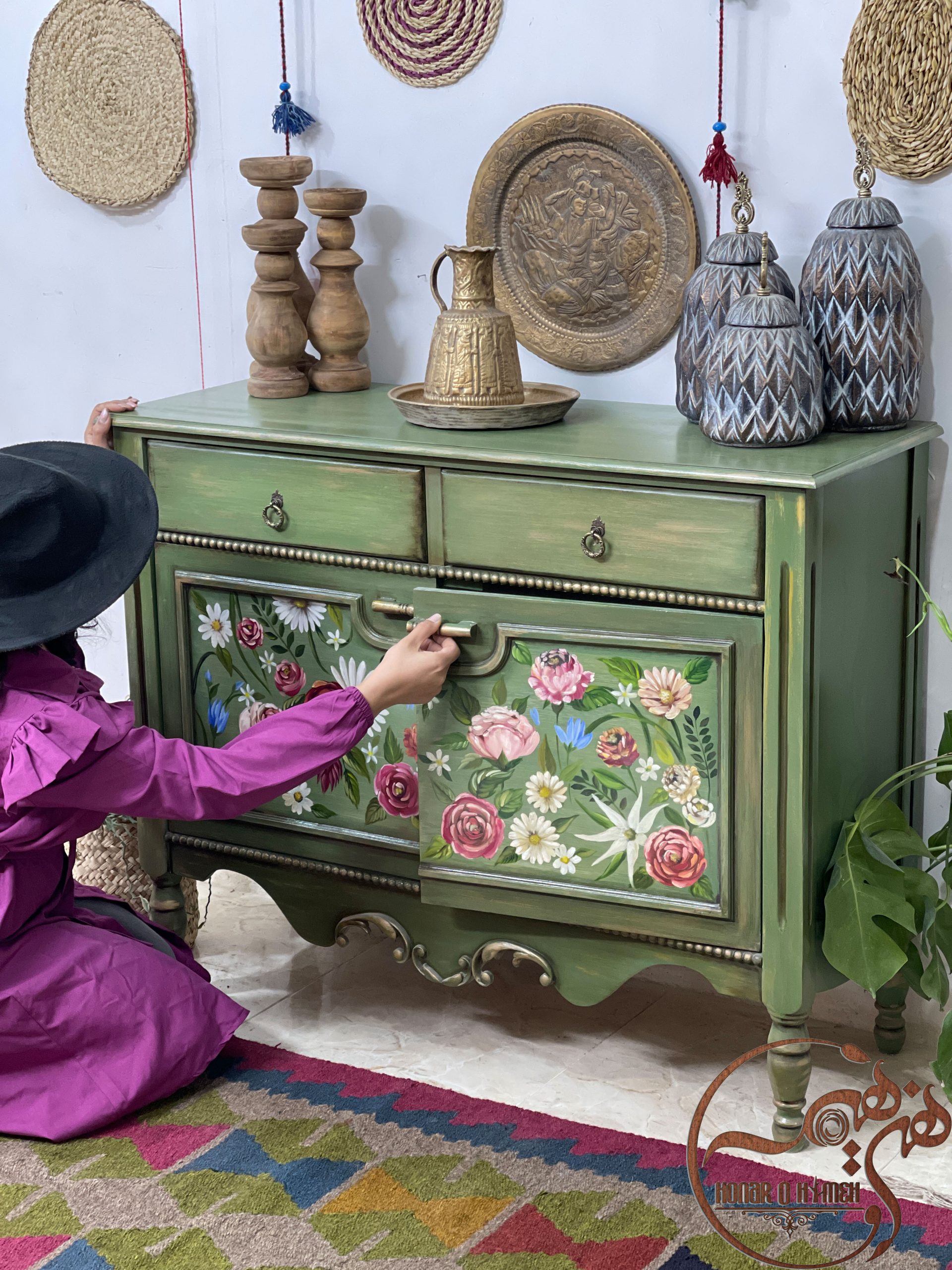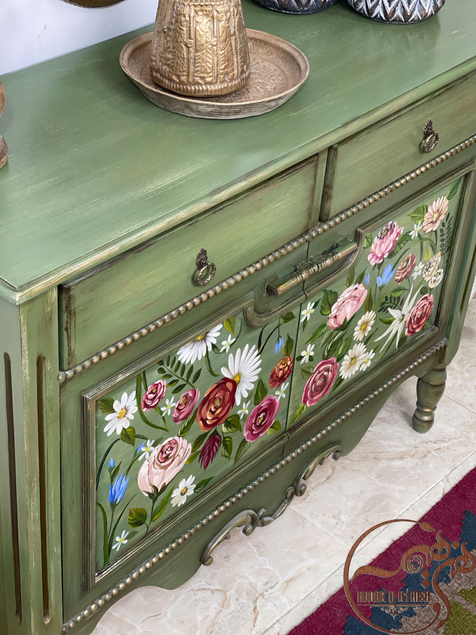 کنسول زیبای مژگان که در مجموعه هنر و هیمه تولید شده است دارای دو کشو در قسمت بالایی و دو درب کمدی در قسمت وسطی این کنسول است که با نقاشی های دلربا و جذابیت بسیار زیادش در دل مشتریان ما خیلی محبوب شده است.