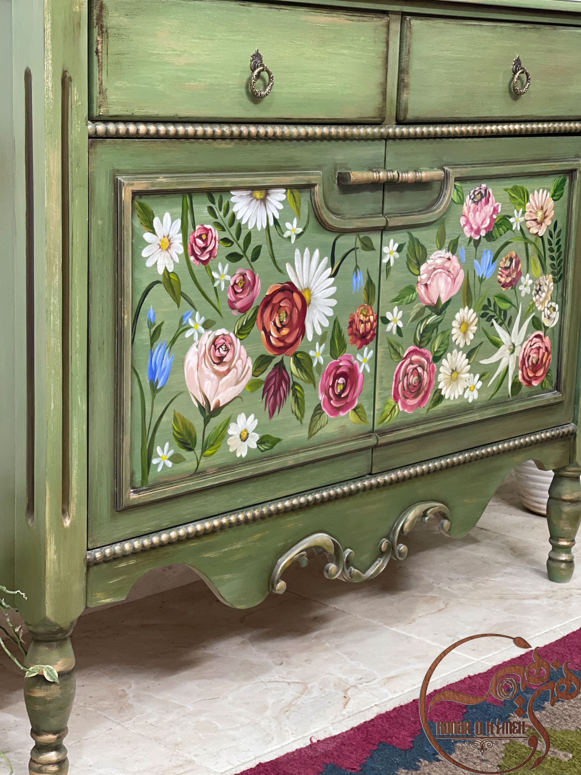 برش های بسیار زیبا که در قسمت چهارچوب این میز کنسول چوبی مژگان قرار گرفته بسیار ظراف کار را بالا تر برده است. در قسمت درب های کمدی پایین این کنسول چوبی نقاشی های پراکنده با نقش گل های مختلف کشیده شده است که شادابی را به رخ می کشد. گل هایی با رنگ قرمز، صورتی کم رنگ، سفید و … که روح تازه ای به منزل شما می بخشد.