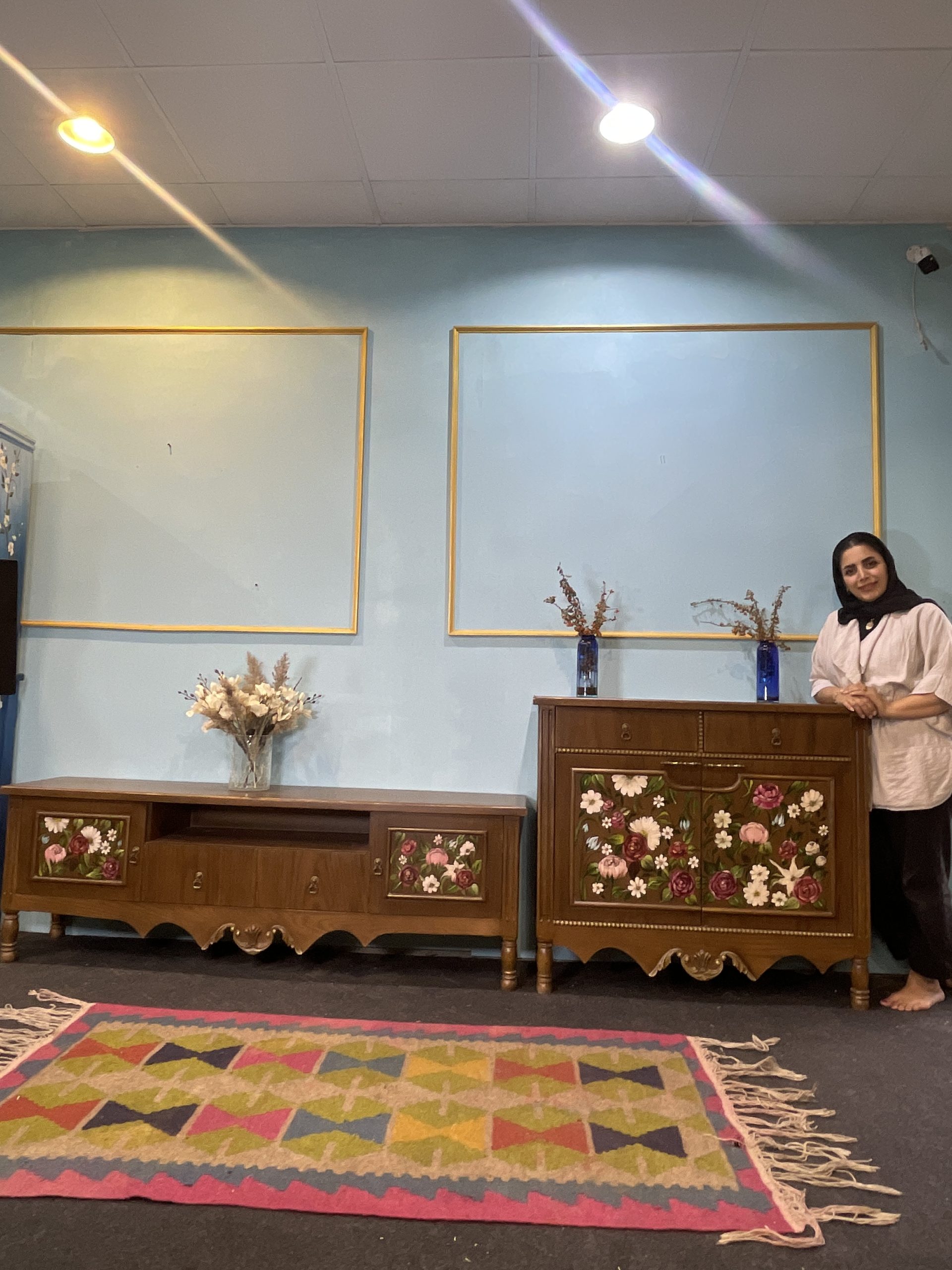 برش های بسیار زیبا که در قسمت چهارچوب این میز کنسول چوبی مژگان قرار گرفته بسیار ظراف کار را بالا تر برده است. در قسمت درب های کمدی پایین این کنسول چوبی نقاشی های پراکنده با نقش گل های مختلف کشیده شده است که شادابی را به رخ می کشد. گل هایی با رنگ قرمز، صورتی کم رنگ، سفید و … که روح تازه ای به منزل شما می بخشد.